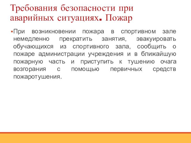Требования безопасности при аварийных ситуациях. ПожарПри возникновении пожара в спортивном зале немедленно прекратить занятия, эвакуировать обучающихся из
