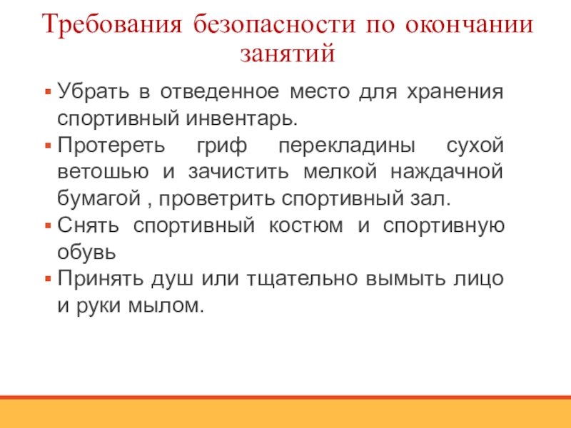 Требования безопасности по окончании занятийУбрать в отведенное место для хранения спортивный инвентарь.Протереть гриф перекладины сухой ветошью и
