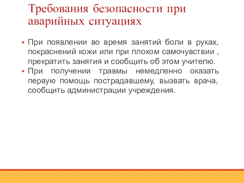 Требования безопасности при аварийных ситуацияхПри появлении во время занятий боли в руках, покраснений кожи или при плохом