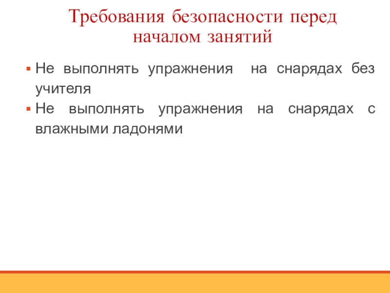 Требования безопасности перед началом занятийНе выполнять упражнения на снарядах без учителяНе выполнять упражнения на снарядах с влажными