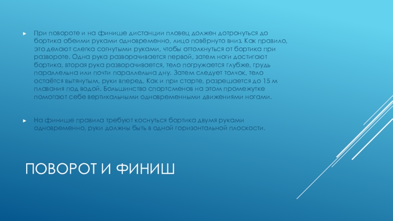 до бортика обеими руками одновременно, лицо повёрнуто вниз. Как правило, это делают слегка согнутыми руками, чтобы оттолкнуться от бортика при развороте. Одна рука разворачивается первой, затем ноги достигают бортика, вторая рука разворачивается, тело погружается глубже, грудь параллельна или почти параллельна дну. Затем следует толчок, тело остаётся вытянутым, руки вперед. Как и при старте, разрешается до 15 м плавания под водой. Большинство спортсменов на этом промежутке помогают себе вертикальными одновременными движениями ногами.