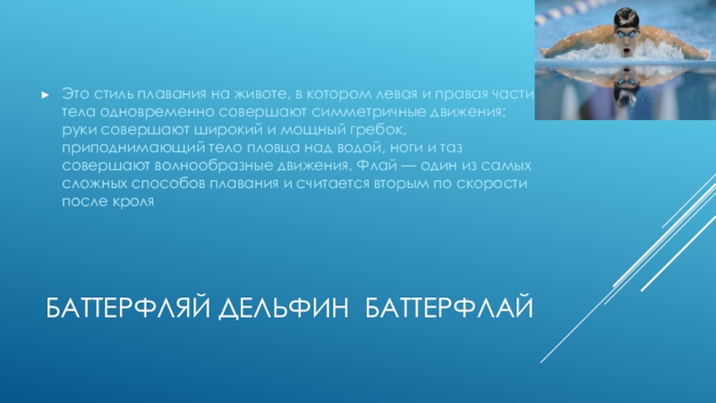 Слайд 3Баттерфляй появился при «модернизации» брасса. Руки стали проносить над поверхностью воды,