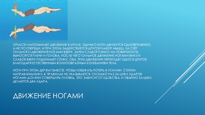 Слайд 7Отчасти напоминает движение в кроле, однако ноги движутся одновременно, а не