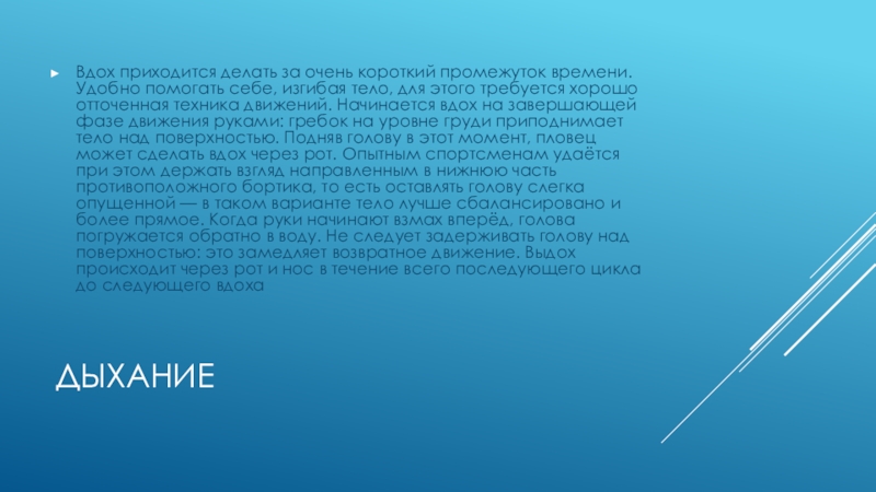 себе, изгибая тело, для этого требуется хорошо отточенная техника движений. Начинается вдох на завершающей фазе движения руками: гребок на уровне груди приподнимает тело над поверхностью. Подняв голову в этот момент, пловец может сделать вдох через рот. Опытным спортсменам удаётся при этом держать взгляд направленным в нижнюю часть противоположного бортика, то есть оставлять голову слегка опущенной — в таком варианте тело лучше сбалансировано и более прямое. Когда руки начинают взмах вперёд, голова погружается обратно в воду. Не следует задерживать голову над поверхностью: это замедляет возвратное движение. Выдох происходит через рот и нос в течение всего последующего цикла до следующего вдоха