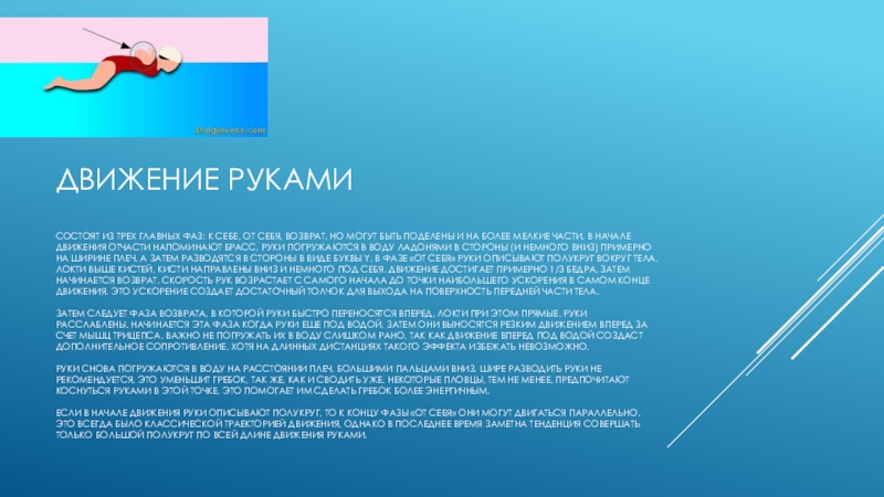 но могут быть поделены и на более мелкие части. В начале движения отчасти напоминают брасс, руки погружаются в воду ладонями в стороны (и немного вниз) примерно на ширине плеч, а затем разводятся в стороны в виде буквы Y. В фазе «от себя» руки описывают полукруг вокруг тела, локти выше кистей, кисти направлены вниз и немного под себя. Движение достигает примерно 1/3 бедра, затем начинается возврат. Скорость рук возрастает с самого начала до точки наибольшего ускорения в самом конце движения. Это ускорение создает достаточный толчок для выхода на поверхность передней части тела.