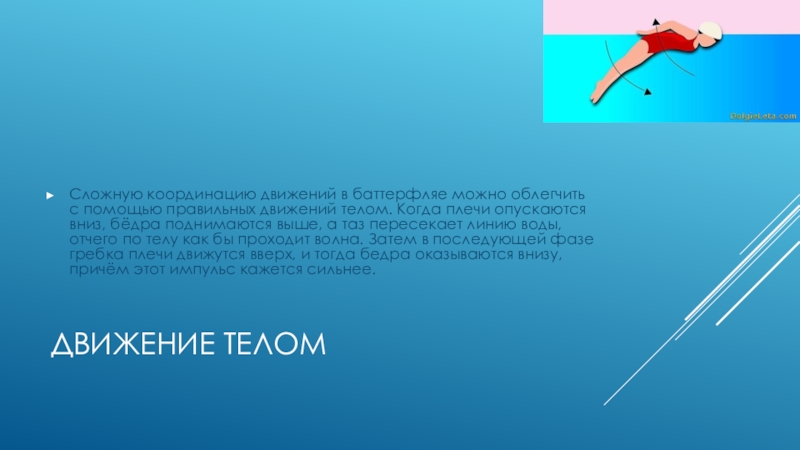 правильных движений телом. Когда плечи опускаются вниз, бёдра поднимаются выше, а таз пересекает линию воды, отчего по телу как бы проходит волна. Затем в последующей фазе гребка плечи движутся вверх, и тогда бедра оказываются внизу, причём этот импульс кажется сильнее.