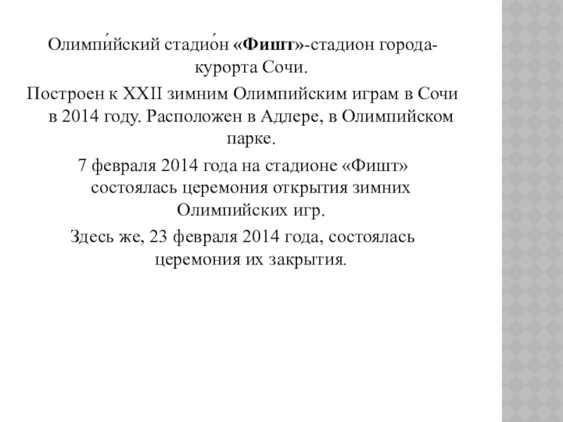 Слайд 2Олимпи́йский стадио́н «Фишт»-стадион города-курорта Сочи.