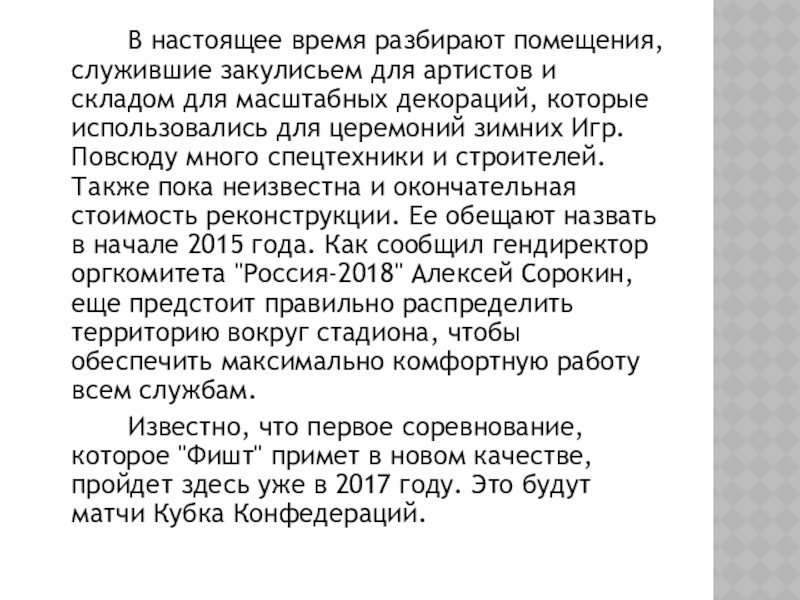 для масштабных декораций, которые использовались для церемоний зимних Игр. Повсюду много спецтехники и строителей. Также пока неизвестна и окончательная стоимость реконструкции. Ее обещают назвать в начале 2015 года. Как сообщил гендиректор оргкомитета "Россия-2018" Алексей Сорокин, еще предстоит правильно распределить территорию вокруг стадиона, чтобы обеспечить максимально комфортную работу всем службам.