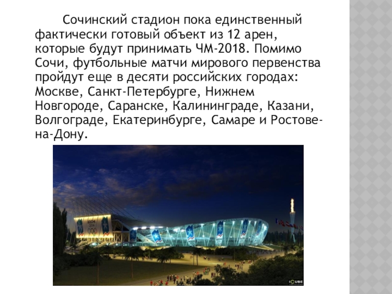 Слайд 9 Сочинский стадион пока единственный фактически готовый объект из 12 арен, которые