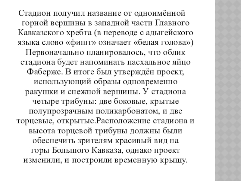 (в переводе с адыгейского языка слово «фишт» означает «белая голова») Первоначально планировалось, что облик стадиона будет напоминать пасхальное яйцо Фаберже. В итоге был утверждён проект, использующий образы одновременно ракушки и снежной вершины. У стадиона четыре трибуны: две боковые, крытые полупрозрачным поликарбонатом, и две торцевые, открытые.Расположение стадиона и высота торцевой трибуны должны были обеспечить зрителям красивый вид на горы Большого Кавказа, однако проект изменили, и построили временную крышу.
