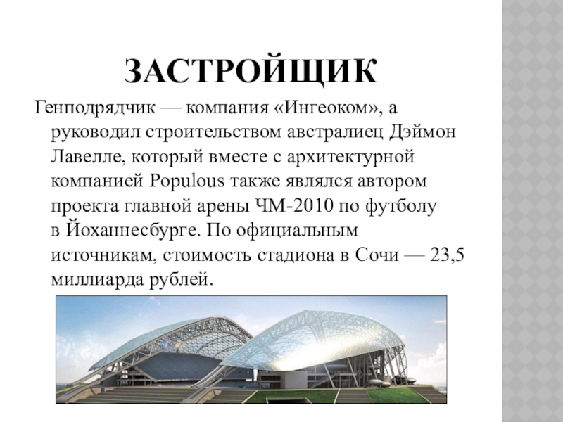 с архитектурной компанией Populous также являлся автором проекта главной арены ЧМ-2010 по футболу в Йоханнесбурге. По официальным источникам, стоимость стадиона в Сочи — 23,5 миллиарда рублей.