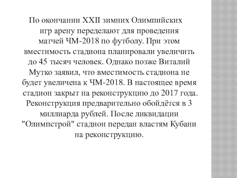 Слайд 6По окончании XXII зимних Олимпийских игр арену переделают для проведения матчей ЧМ-2018 по футболу.
