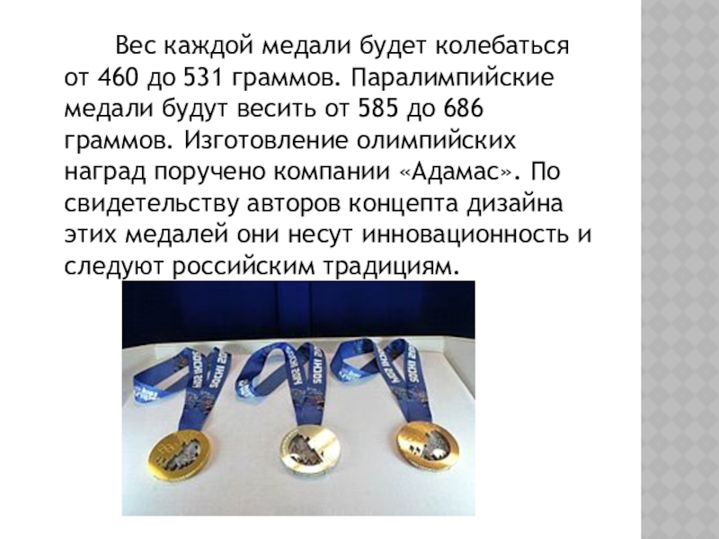 Слайд 12 Вес каждой медали будет колебаться от 460 до 531 граммов. Паралимпийские
