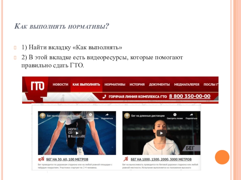 Как выполнять нормативы?1) Найти вкладку «Как выполнять»2) В этой вкладке есть видеоресурсы, которые помогают правильно сдать ГТО.