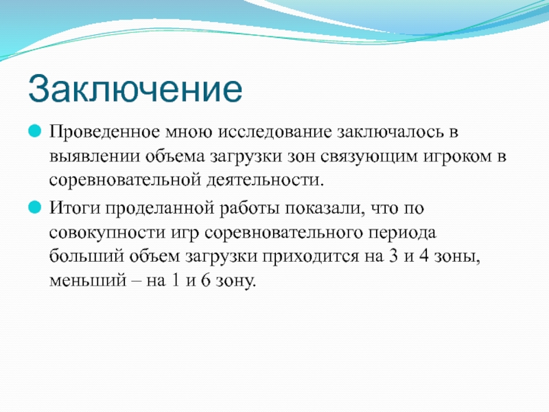 Итоги проделанной работы показали, что по совокупности игр соревновательного периода больший объем загрузки приходится на 3 и 4 зоны, меньший – на 1 и 6 зону.