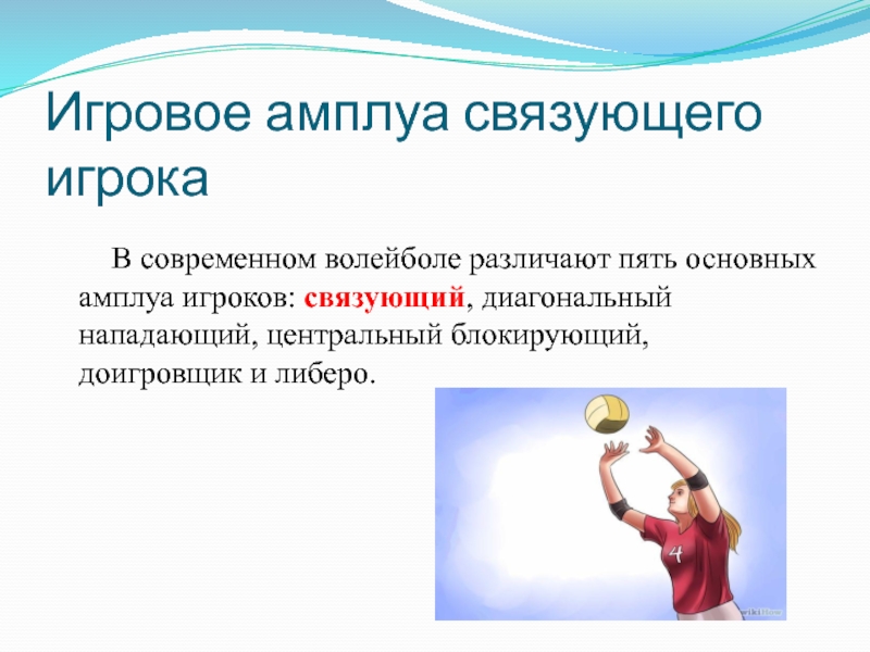связующий, диагональный нападающий, центральный блокирующий, доигровщик и либеро.