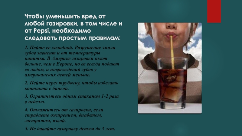 1. Пейте ее холодной. Разрушение эмали зубов зависит и от температуры напитка. В Америке газировки пьют больше, чем в Европе, но ее всегда подают со льдом, и повреждений зубов у американских детей меньше.