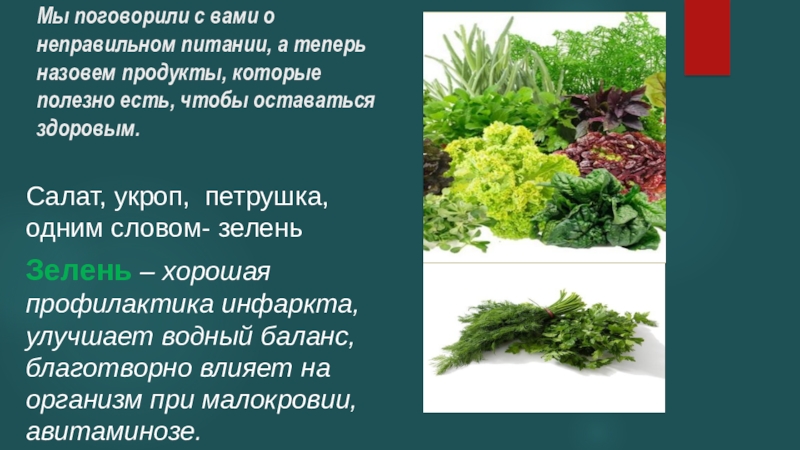 Зелень – хорошая профилактика инфаркта, улучшает водный баланс, благотворно влияет на организм при малокровии, авитаминозе.