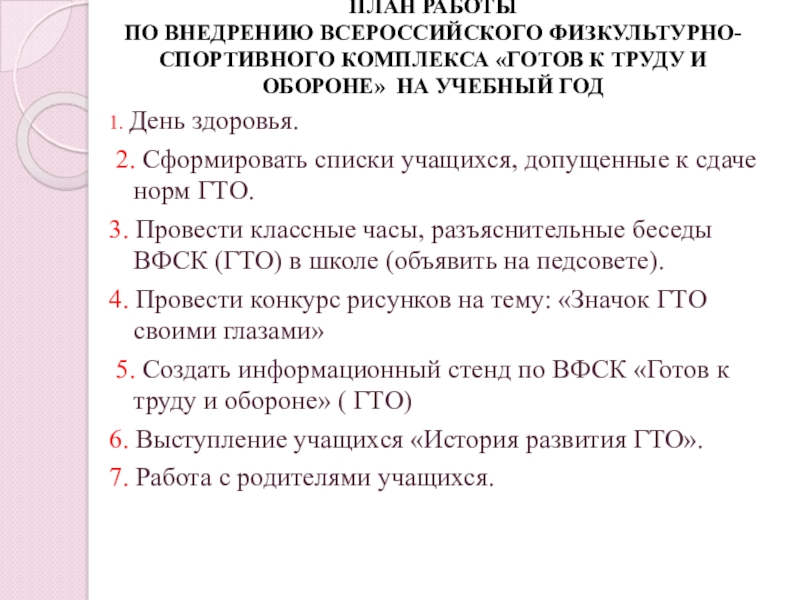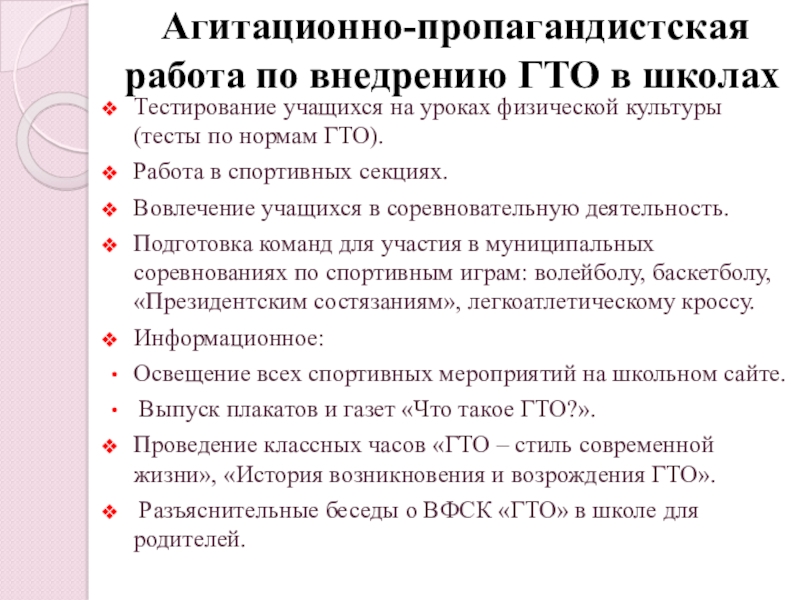 3. Провести классные часы, разъяснительные беседы ВФСК (ГТО) в школе (объявить на педсовете).