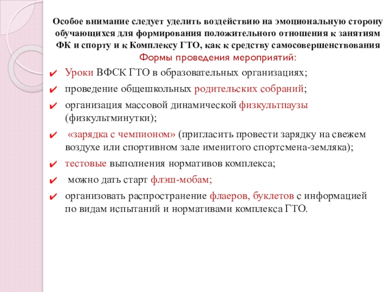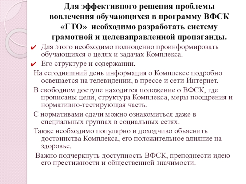 Важно подчеркнуть доступность ВФСК, преподнести идею его престижности и общественной значимости.