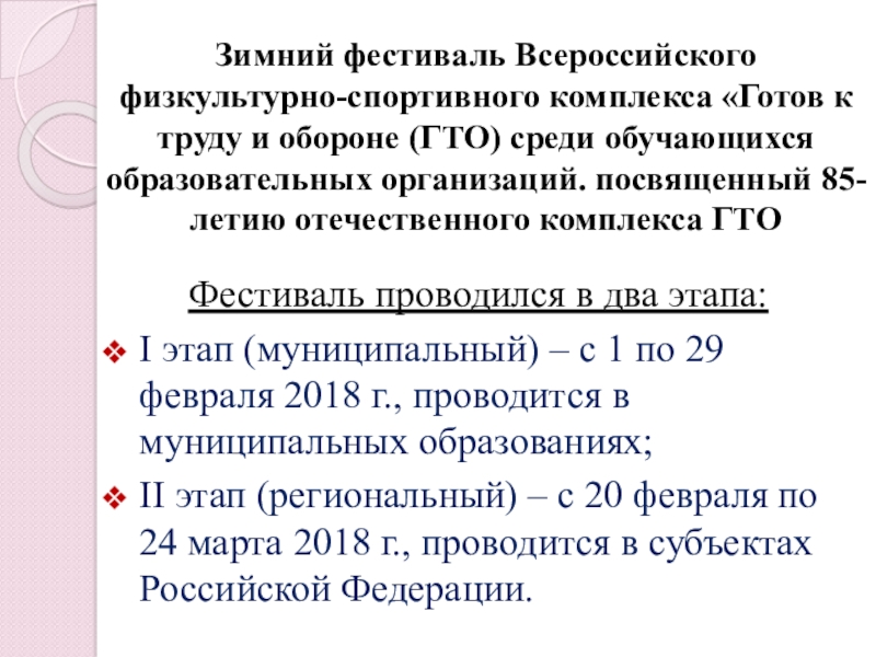 I этап (муниципальный) – с 1 по 29 февраля 2018 г., проводится в муниципальных образованиях;