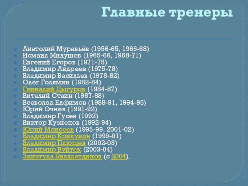 Главные тренеры Анатолий Муравьёв (1956-65, 1966-68) Исмаил Милушев (1965-66, 1968-71) Евгений Егоров (1971-75) Владимир Андреев (1975-78) Владимир