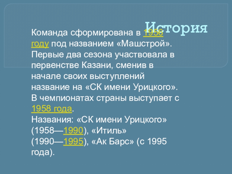 ИсторияКоманда сформирована в 1956 году под названием «Машстрой». Первые два сезона участвовала в первенстве Казани, сменив в начале своих выступлений название на «СК имени Урицкого». В чемпионатах страны выступает с 1958 года.Названия: «СК имени Урицкого» (1958—1990),