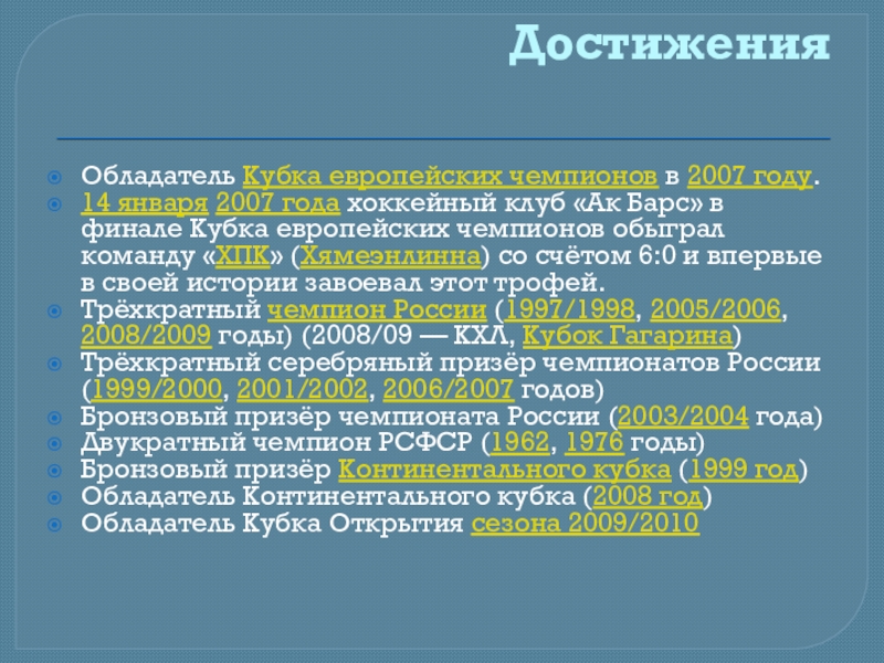 Достижения Обладатель Кубка европейских чемпионов в 2007 году. 14 января 2007 года хоккейный клуб «Ак Барс» в