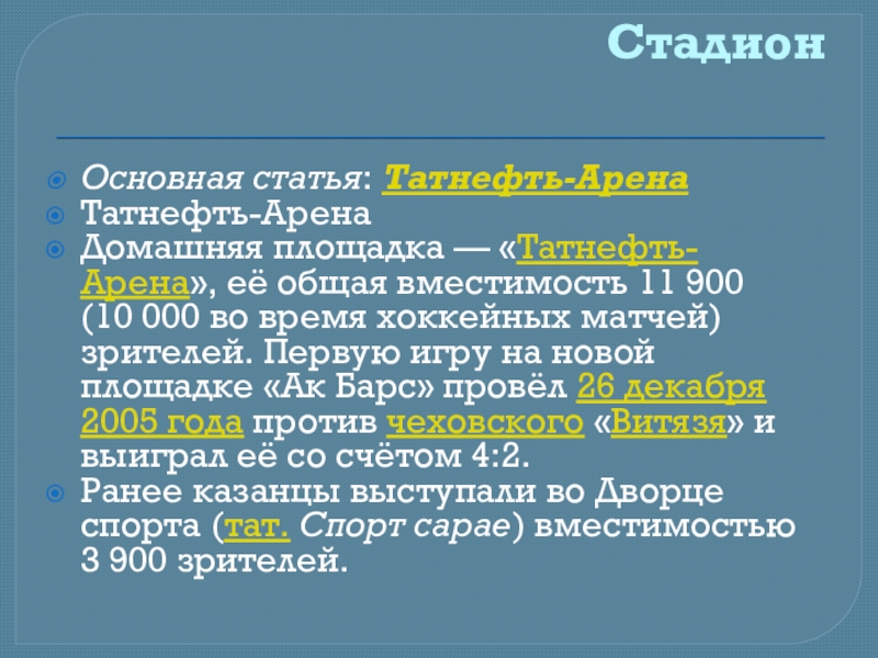 Стадион Основная статья: Татнефть-АренаТатнефть-АренаДомашняя площадка — «Татнефть-Арена», её общая вместимость 11 900 (10 000 во время хоккейных матчей) зрителей. Первую