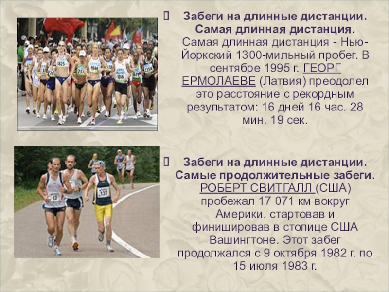 Слайд 14Забеги на длинные дистанции. Самая длинная дистанция.