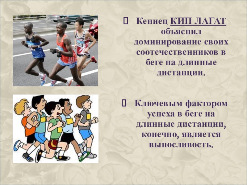 Слайд 12Кениец КИП ЛАГАТ объяснил доминирование своих соотечественников в беге на длинные