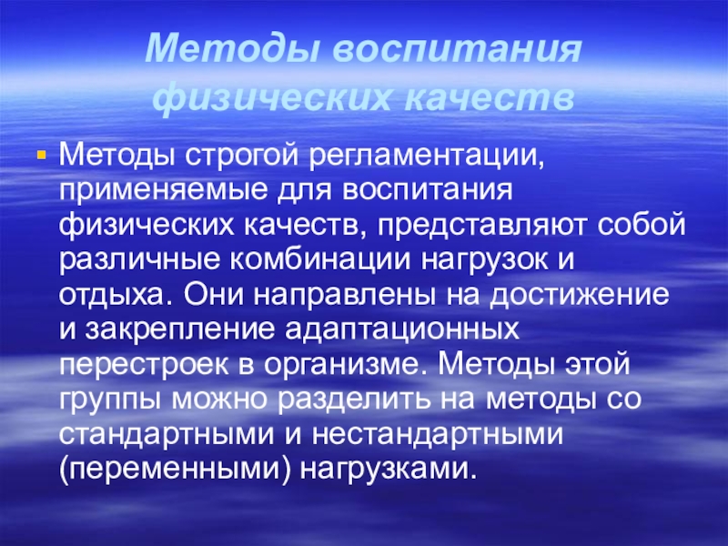 представляют собой различные комбинации нагрузок и отдыха. Они направлены на достижение и закрепление адаптационных перестроек в организме. Методы этой группы можно разделить на методы со стандартными и нестандартными (переменными) нагрузками.