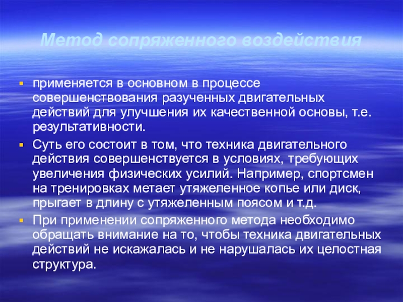 При применении сопряженного метода необходимо обращать внимание на то, чтобы техника двигательных действий не искажалась и не нарушалась их целостная структура.