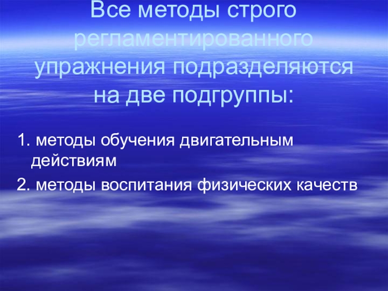 Слайд 8Все методы строго регламентированного упражнения подразделяются на две подгруппы: