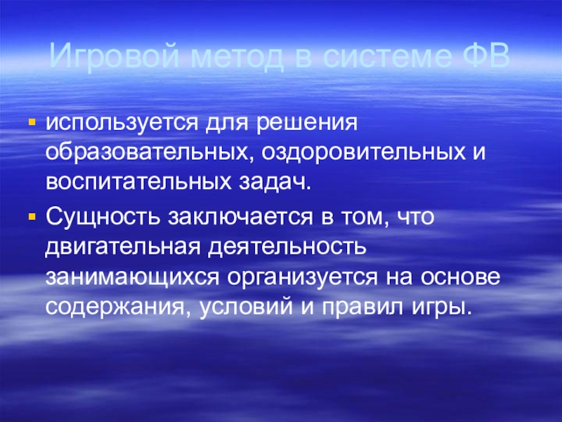 Сущность заключается в том, что двигательная деятельность занимающихся организуется на основе содержания, условий и правил игры.