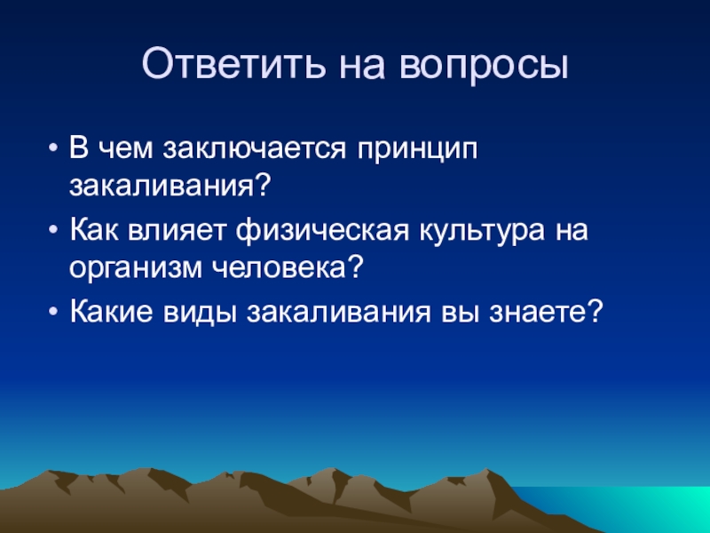 Ответить на вопросыВ чем заключается принцип закаливания?Как влияет физическая культура на организм человека?Какие виды закаливания вы знаете?