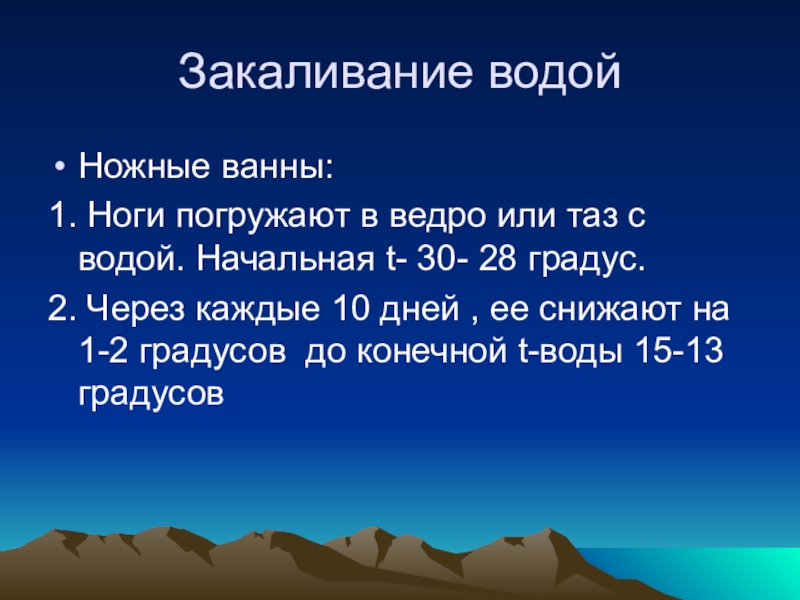 Закаливание водойНожные ванны:1. Ноги погружают в ведро или таз с водой. Начальная t- 30- 28 градус.2. Через