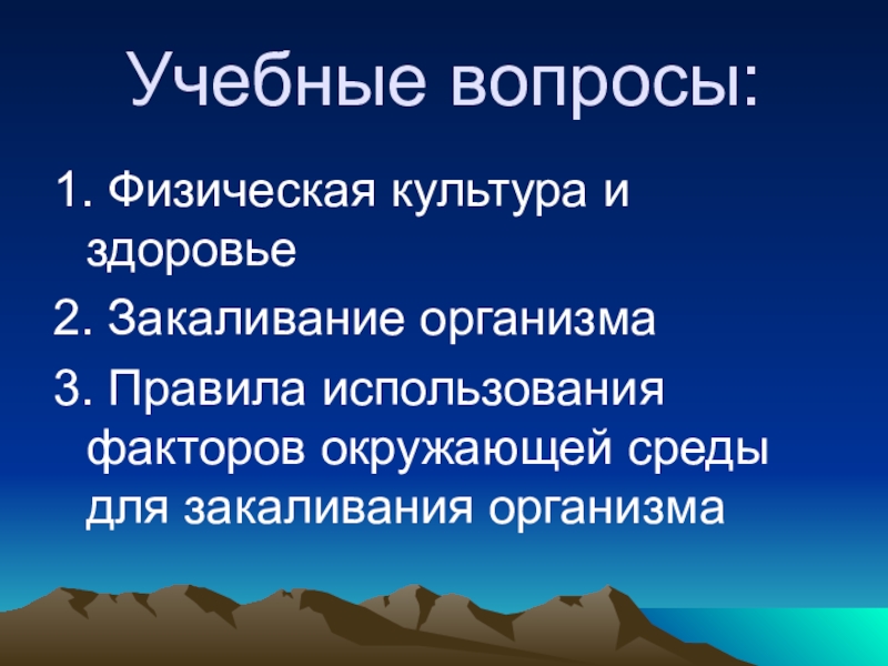 Учебные вопросы:1. Физическая культура и здоровье2. Закаливание организма3. Правила использования факторов окружающей среды для закаливания организма