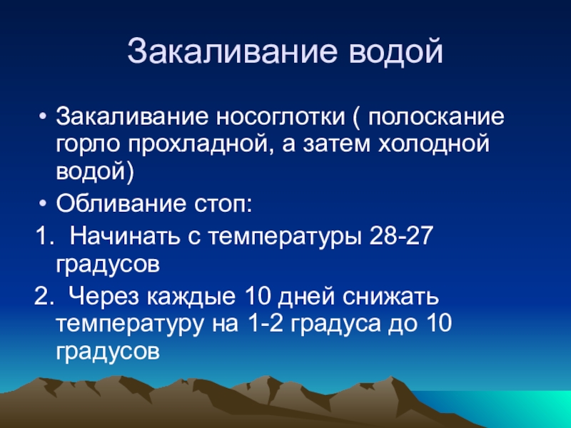 Закаливание водойЗакаливание носоглотки ( полоскание горло прохладной, а затем холодной водой)Обливание стоп:1. Начинать с температуры 28-27 градусов2.