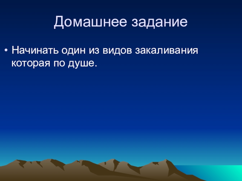 Домашнее заданиеНачинать один из видов закаливания которая по душе.