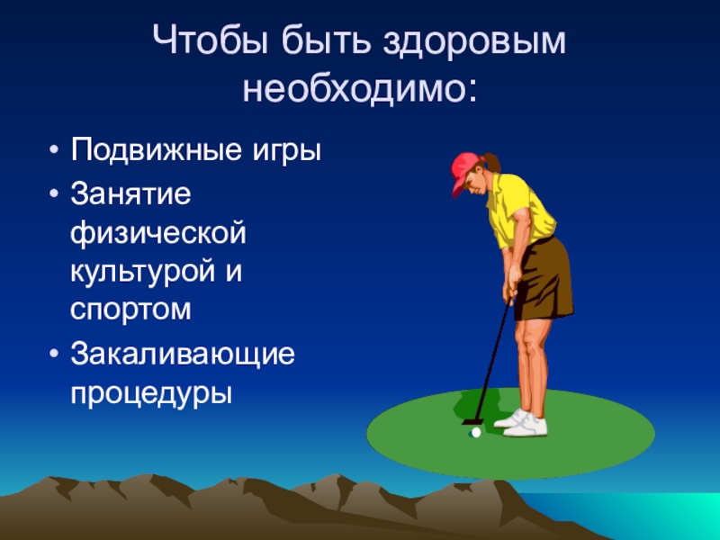 Чтобы быть здоровым необходимо:Подвижные игрыЗанятие физической культурой и спортомЗакаливающие процедуры