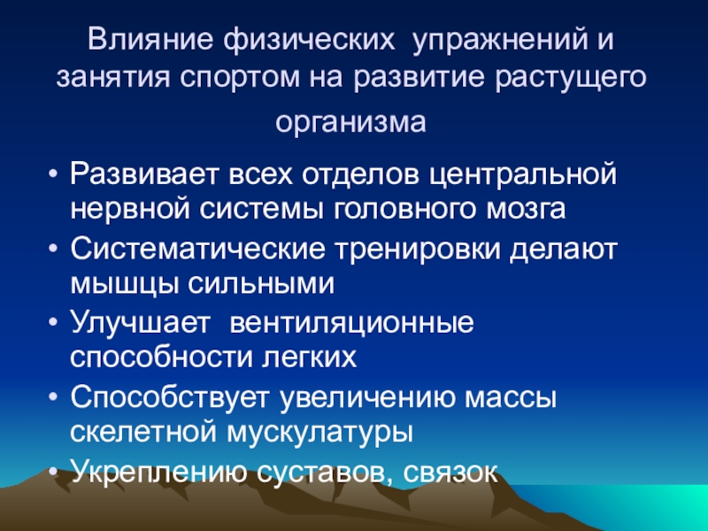 Влияние физических упражнений и занятия спортом на развитие растущего организма Развивает всех отделов центральной нервной системы головного