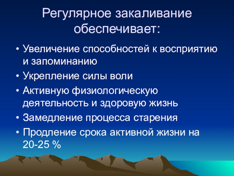 Регулярное закаливание обеспечивает:Увеличение способностей к восприятию и запоминаниюУкрепление силы волиАктивную физиологическую деятельность и здоровую жизньЗамедление процесса старенияПродление