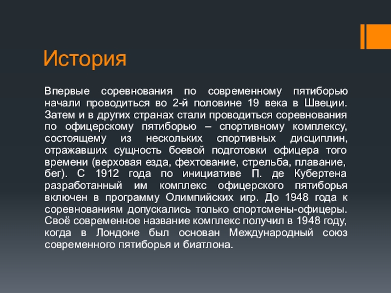 века в Швеции. Затем и в других странах стали проводиться соревнования по офицерскому пятиборью – спортивному комплексу, состоящему из нескольких спортивных дисциплин, отражавших сущность боевой подготовки офицера того времени (верховая езда, фехтование, стрельба, плавание, бег). С 1912 года по инициативе П. де Кубертена разработанный им комплекс офицерского пятиборья включен в программу Олимпийских игр. До 1948 года к соревнованиям допускались только спортсмены-офицеры. Своё современное название комплекс получил в 1948 году, когда в Лондоне был основан Международный союз современного пятиборья и биатлона.