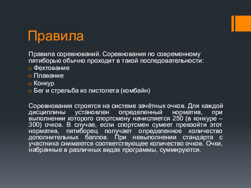 ПравилаПравила соревнований. Соревнования по современному пятиборью обычно проходит в такой последовательности:ФехтованиеПлаваниеКонкурБег и стрельба из пистолета (комбайн)Соревнования строятся