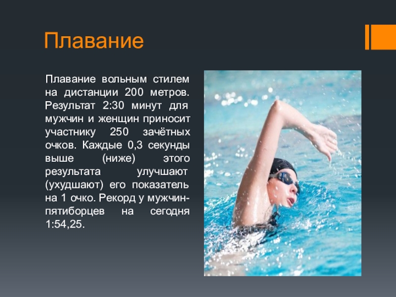 ПлаваниеПлавание вольным стилем на дистанции 200 метров. Результат 2:30 минут для мужчин и женщин приносит участнику 250