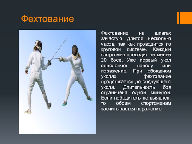 Фехтование на шпагах зачастую длится несколько часов, так как проводится по