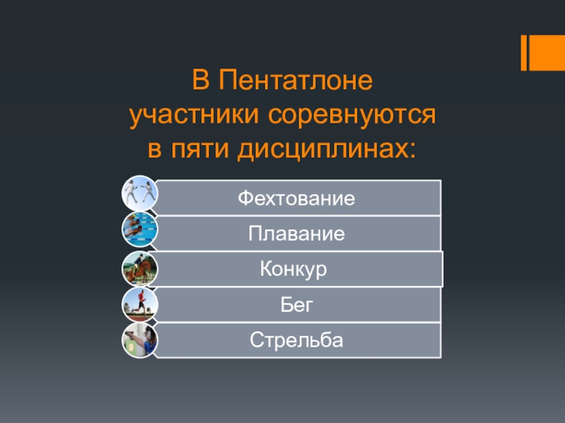 Слайд 2В Пентатлоне участники соревнуются в пяти дисциплинах: