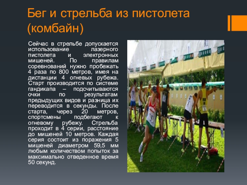 Бег и стрельба из пистолета (комбайн)Сейчас в стрельбе допускается использование лазерного пистолета и электронных мишеней. По правилам
