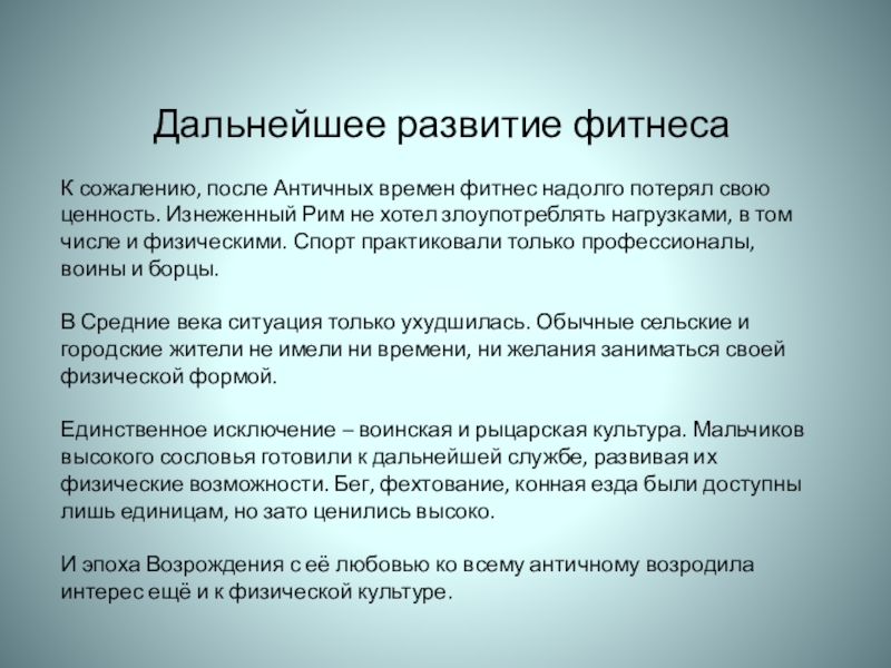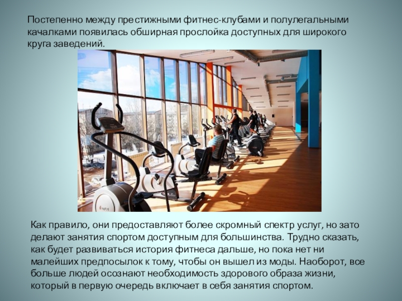 Как правило, они предоставляют более скромный спектр услуг, но зато делают занятия спортом доступным для большинства. Трудно сказать, как будет развиваться история фитнеса дальше, но пока нет ни малейших предпосылок к тому, чтобы он вышел из моды. Наоборот, все больше людей осознают необходимость здорового образа жизни, который в первую очередь включает в себя занятия спортом.